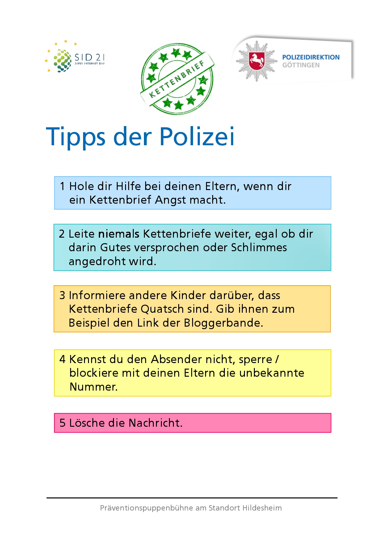 Die Initiative Klicksafe, die Aktionen zum SID in Deutschland koordiniert, setzt in diesem Jahr den Schwerpunkt auf die Frage: „Wem glaubst du? Meinungsbildung zwischen Fakt und Fake“. Wir haben mit dem Fokus auf diesem Thema ein Puppentheaterstück für den vierten Grundschuljahrgang unter dem Aspekt "Kettenbriefe" entwickelt. Dieses haben wir durch Moderation ergänzt und digital aufgenommen.